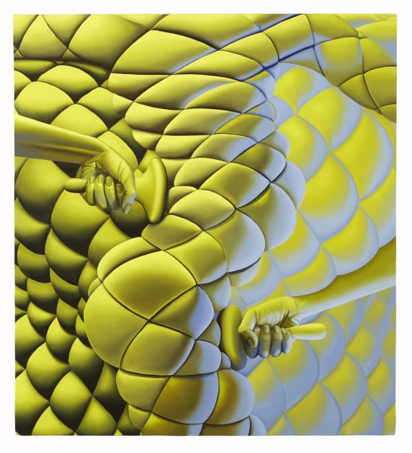 Sascha Braunig devotes her critical focus to the capaciousness and limitations of the feminine form under duress. Braunig’s figures teeter towards overextension—waists are pinched to extremity; appendages are restricted or decked in barbs; phantom silhouettes sinuously negotiate and adapt to the contours of their technicolor environments. Drawing on feminist artistic discourse, Braunig’s imaginaries engage the ways that gender performance and systems of power are replicated. Training, fitting, and reinforcement are recurring motifs in the severe and sometimes sinister crucibles which Braunig’s figures endure. Cast in vibrant complementary palettes and anchored through Braunig’s graphic, tensile formal vocabulary, her images recapitulate and usurp foundational codes of gendered visuality to create surreal and unequivocally emblematic scenes.